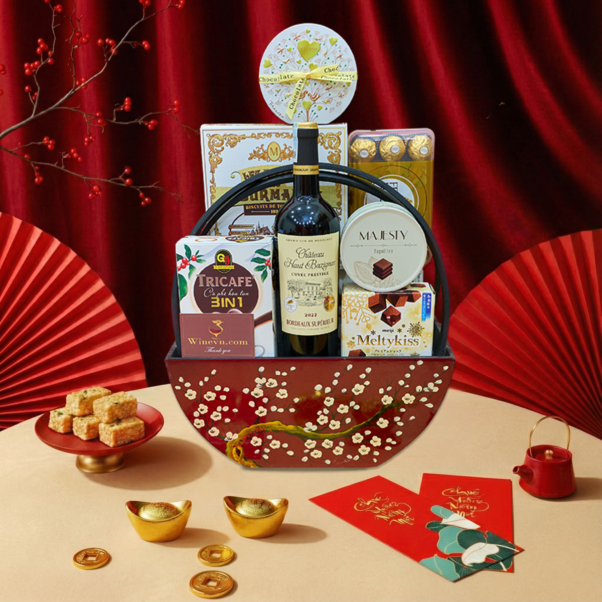 Giỏ Quà Tết Kim Lộc GQT2619 là mẫu quà biếu cao cấp trong bộ sưu tập giỏ quà Tết 2026, gây ấn tượng với gam trắng trang nhã mang ý nghĩa tinh khôi và tài lộc bền vững trong năm mới. Set quà được phối hợp hài hòa giữa rượu vang nhập khẩu cùng bánh kẹo nhập khẩu cao cấp và cà phê Việt Nam, phù hợp biếu tặng đối tác, khách hàng và gia đình trong những dịp gặp gỡ đầu xuân.