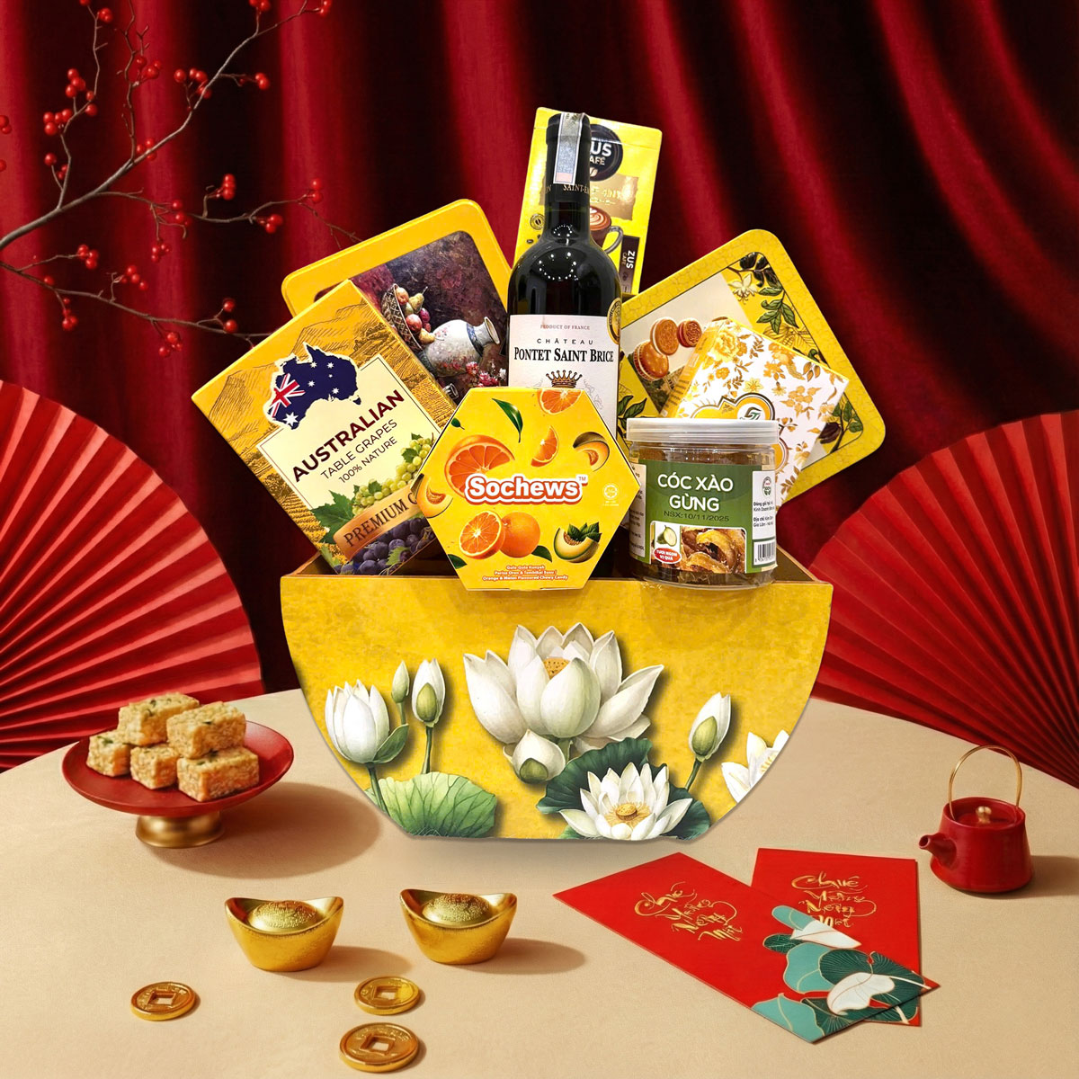 Giỏ được thiết kế theo sắc vàng chủ đạo, gam màu tượng trưng cho sự ấm áp, thịnh vượng và nguồn năng lượng mới trong Tết Bính Ngọ. Họa tiết hoa sen trên thân giỏ mang ý nghĩa thanh khiết, thuận hòa, gợi hình ảnh năm mới an vui và hanh thông trong mọi phương diện.