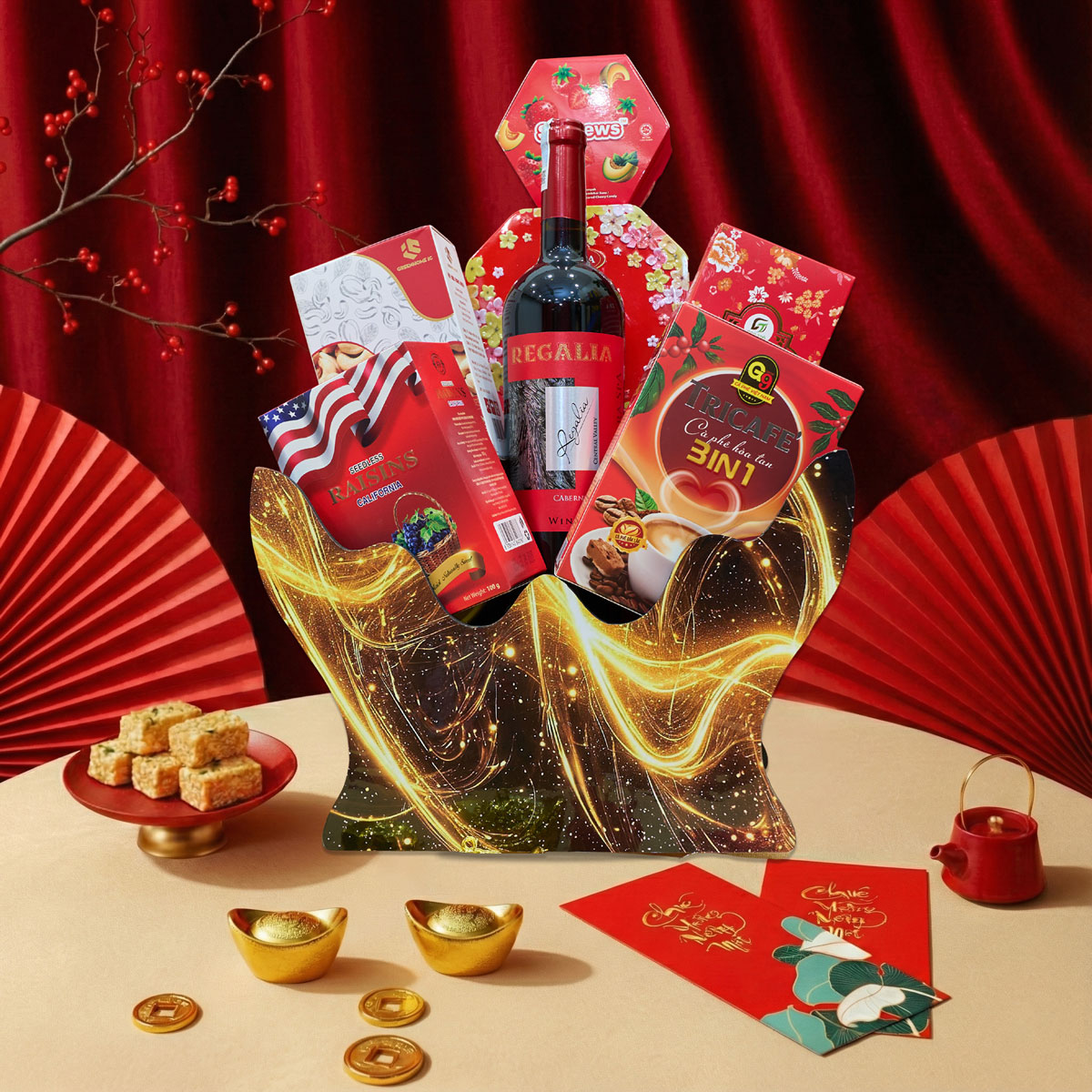 Giỏ Quà Tết Tài Lộc GQT2606 là lựa chọn nổi bật trong bộ sưu tập giỏ quà Tết 2026, được thiết kế với gam đỏ chủ đạo mang ý nghĩa chiêu tài đón lộc trong năm Bính Ngọ. Sự kết hợp hài hòa giữa rượu vang nhập khẩu cùng trà, cà phê và bánh kẹo chọn lọc giúp set quà phù hợp biếu tặng khách hàng, đối tác và người thân trong dịp đầu xuân.