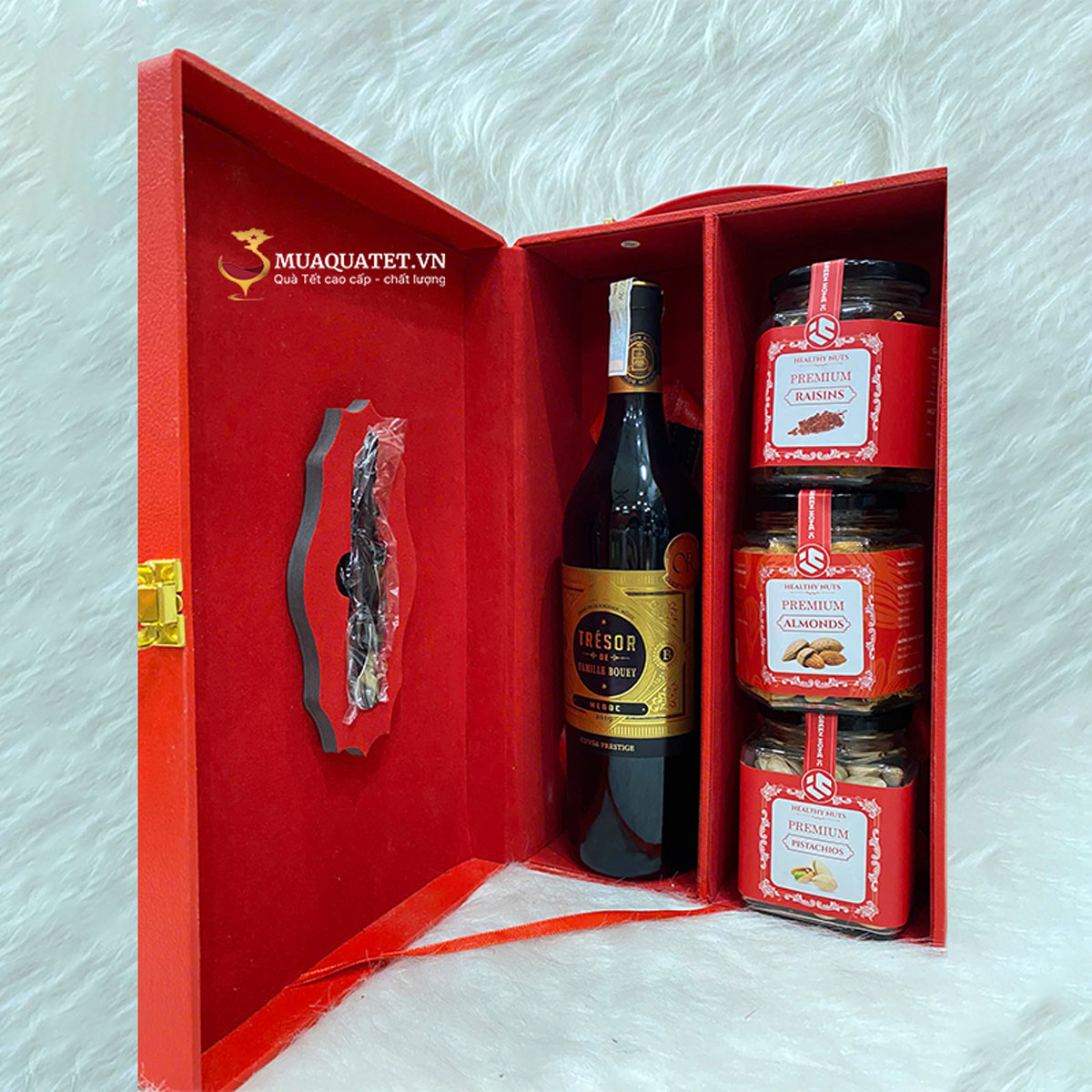 Đại Cát HQT2607 là set hộp quà Tết 2026 sang trọng với rượu vang Pháp và bộ ba hạt dinh dưỡng cao cấp, được thiết kế trong hộp đỏ nổi bật tạo ấn tượng mạnh về sự may mắn và phú quý. Đây là lựa chọn lý tưởng cho doanh nghiệp và khách hàng cá nhân đang tìm kiếm quà Tết chỉnh chu, phù hợp biếu tặng đối tác, cấp quản lý và người thân trong dịp Tết Bính Ngọ 2026.