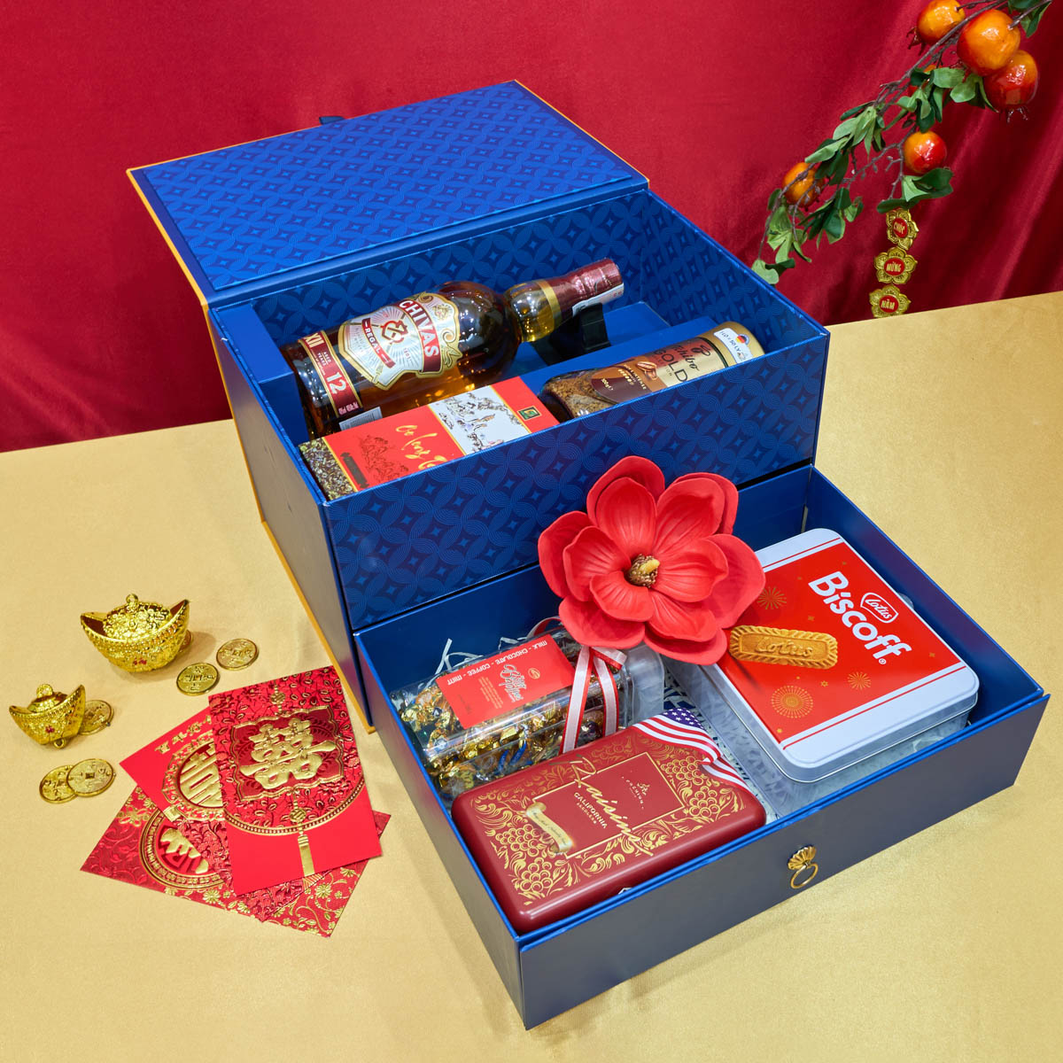 Gam đỏ truyền thống đại diện cho tài lộc, hanh thông và những khởi đầu thuận lợi trong năm mới. Thiết kế hộp quà 2 tầng tạo cảm giác chỉn chu, bề thế, thể hiện sự trân trọng và đầu tư nghiêm túc trong mối quan hệ biếu tặng.