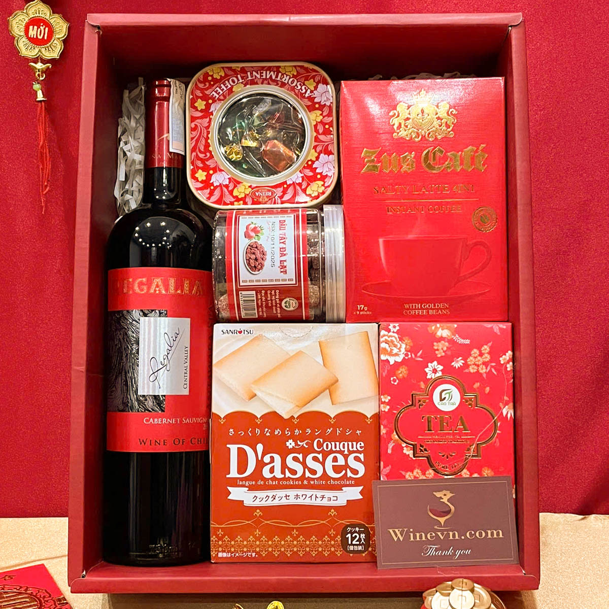 Rượu vang: Thường là vang đỏ phổ thông hoặc vang không cồn, dung tích 750ml tiêu chuẩn, hương vị dễ uống. Rượu vang giúp hộp quà Tết trông chỉn chu và có điểm nhấn, phù hợp tặng người lớn, đối tác đại trà hoặc sử dụng trong bữa tiệc gia đình dịp Tết.