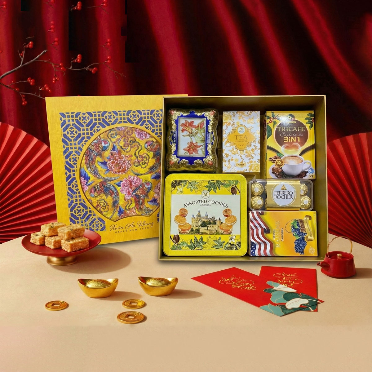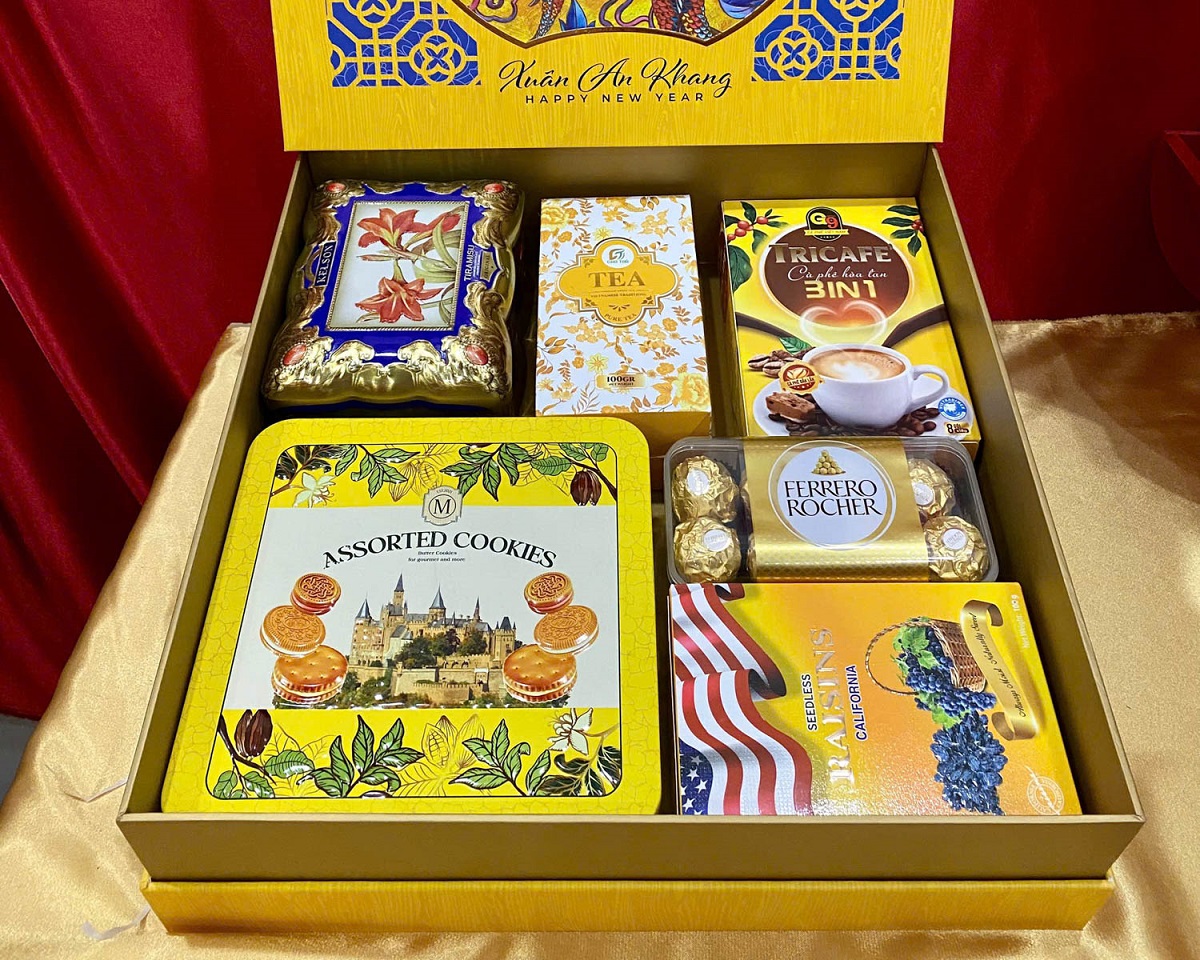 HQT2664 là mẫu hộp quà Tết cao cấp mang sắc vàng sang trọng, được thiết kế nổi bật với họa tiết truyền thống tinh xảo. Set quà quy tụ các sản phẩm bánh kẹo, trà và cà phê quen thuộc ngày Tết, phù hợp biếu tặng gia đình, đối tác hoặc khách hàng với thông điệp khởi đầu năm mới sung túc và đủ đầy.