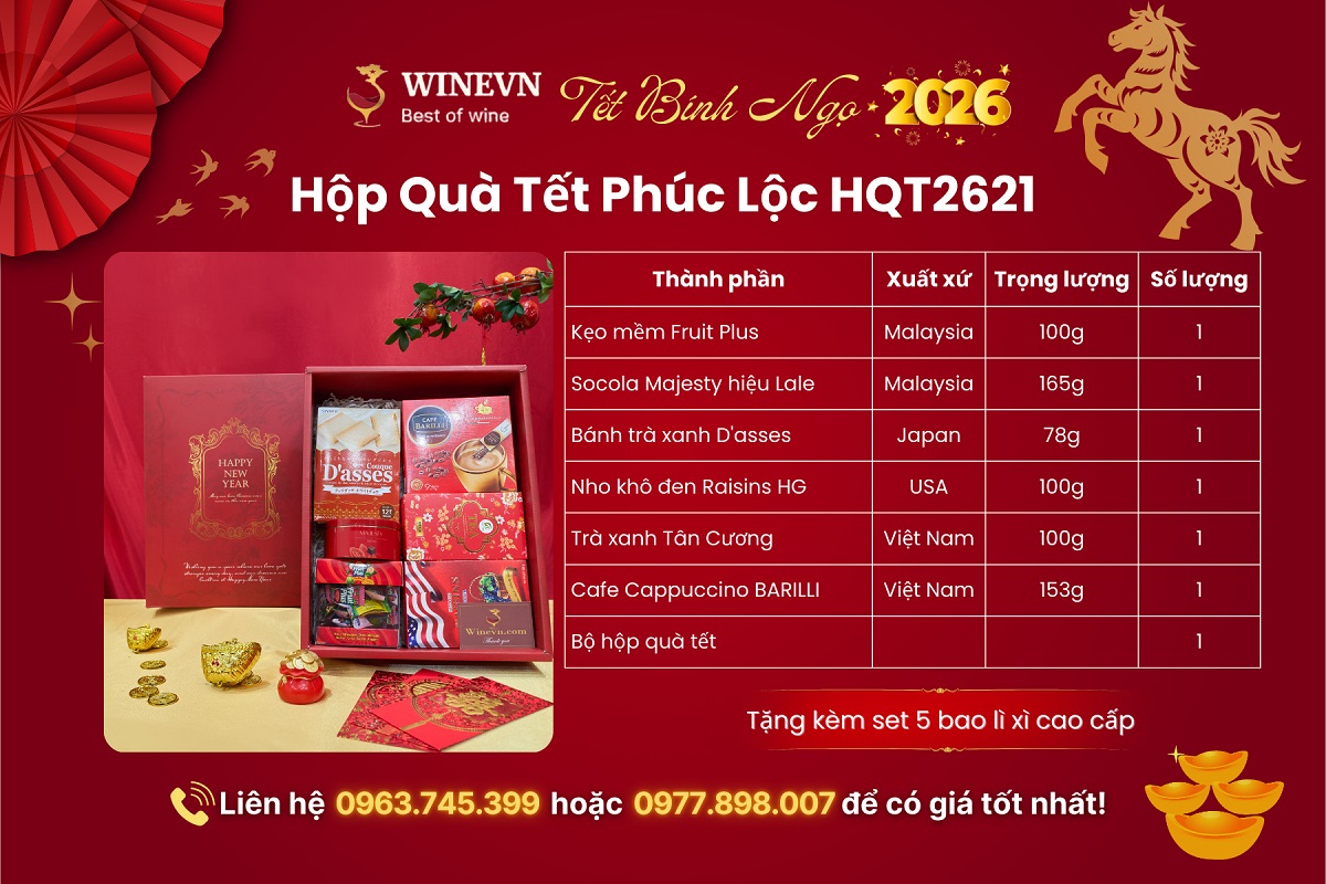Hộp Quà Tết Phúc Lộc HQT2621 sở hữu thiết kế tông đỏ rực rỡ, đại diện cho may mắn và tài lộc trong năm Bính Ngọ 2026. Thành phần quà được kết hợp hài hòa giữa bánh – kẹo – trà – cà phê, phù hợp biếu tặng gia đình, đồng nghiệp hoặc đối tác. Khách hàng có thể tham khảo thêm các mẫu hộp quà Tết 2026 theo nhiều mức giá khác nhau tại Mua Quà Tết.