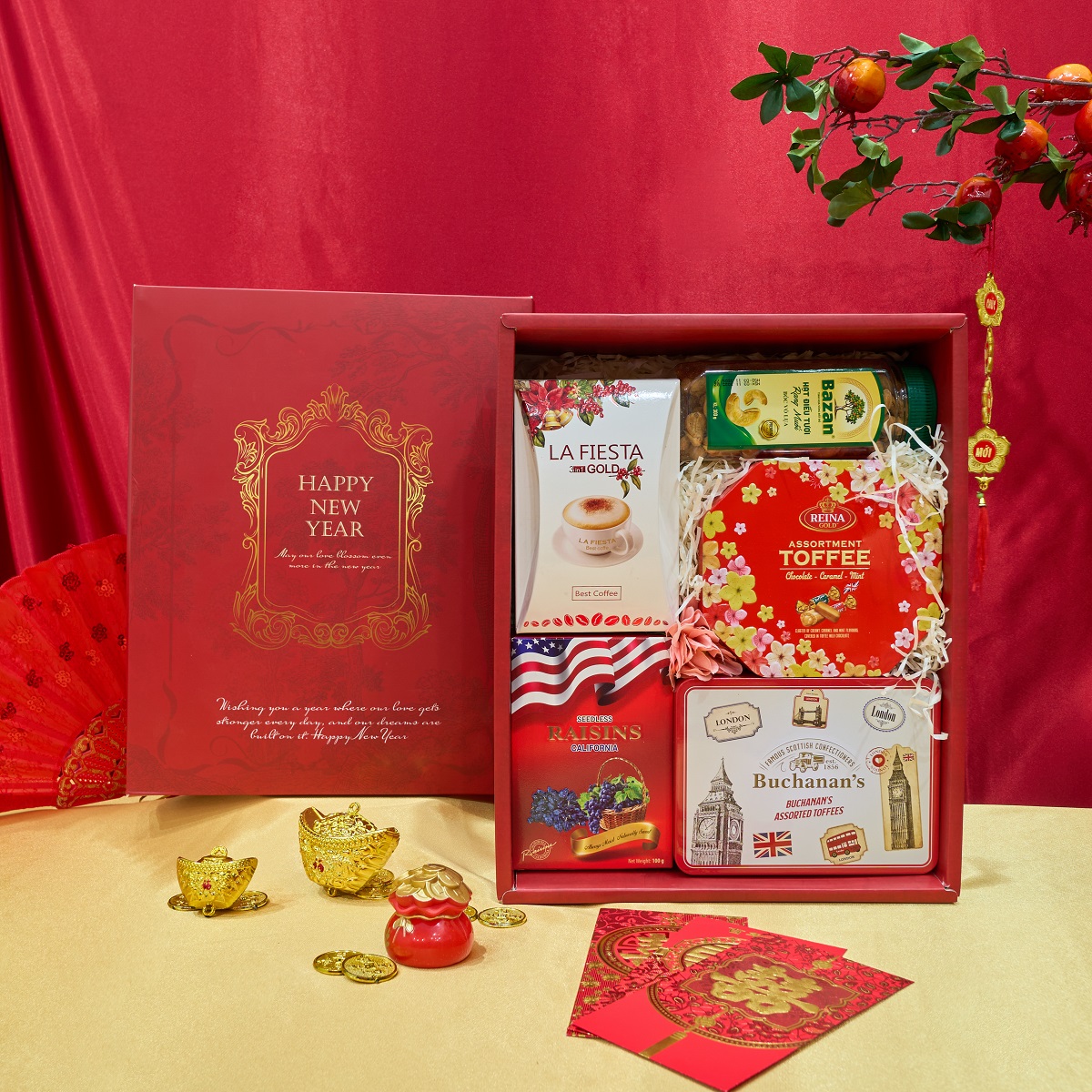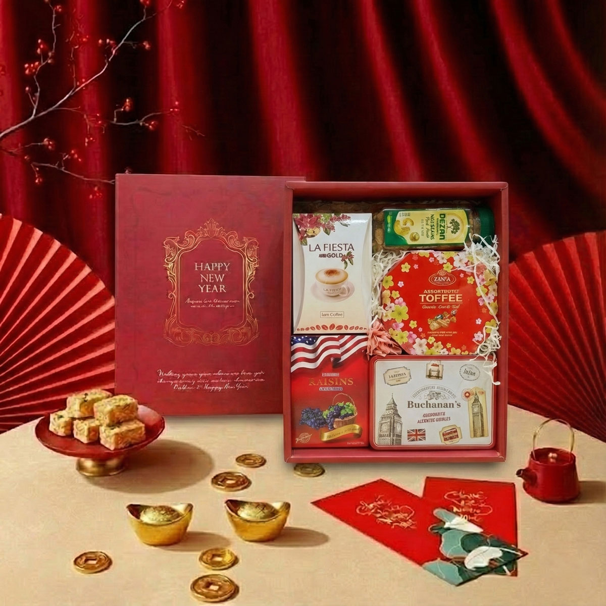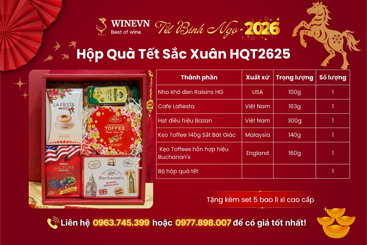 Hộp Quà Tết Sắc Xuân HQT2625 thuộc bộ sưu tập hộp quà Tết 2026 cao cấp với thiết kế đỏ chủ đạo, tượng trưng cho may mắn, phúc khí và sự khởi đầu trọn vẹn trong năm Bính Ngọ 2026. Set quà kết hợp tinh chọn từ nho khô Mỹ, hạt điều Việt Nam, kẹo toffee nhập khẩu và cà phê Lafiesta, tạo nên món quà sang trọng phù hợp biếu tặng người thân, đồng nghiệp và khách hàng trong dịp Tết.