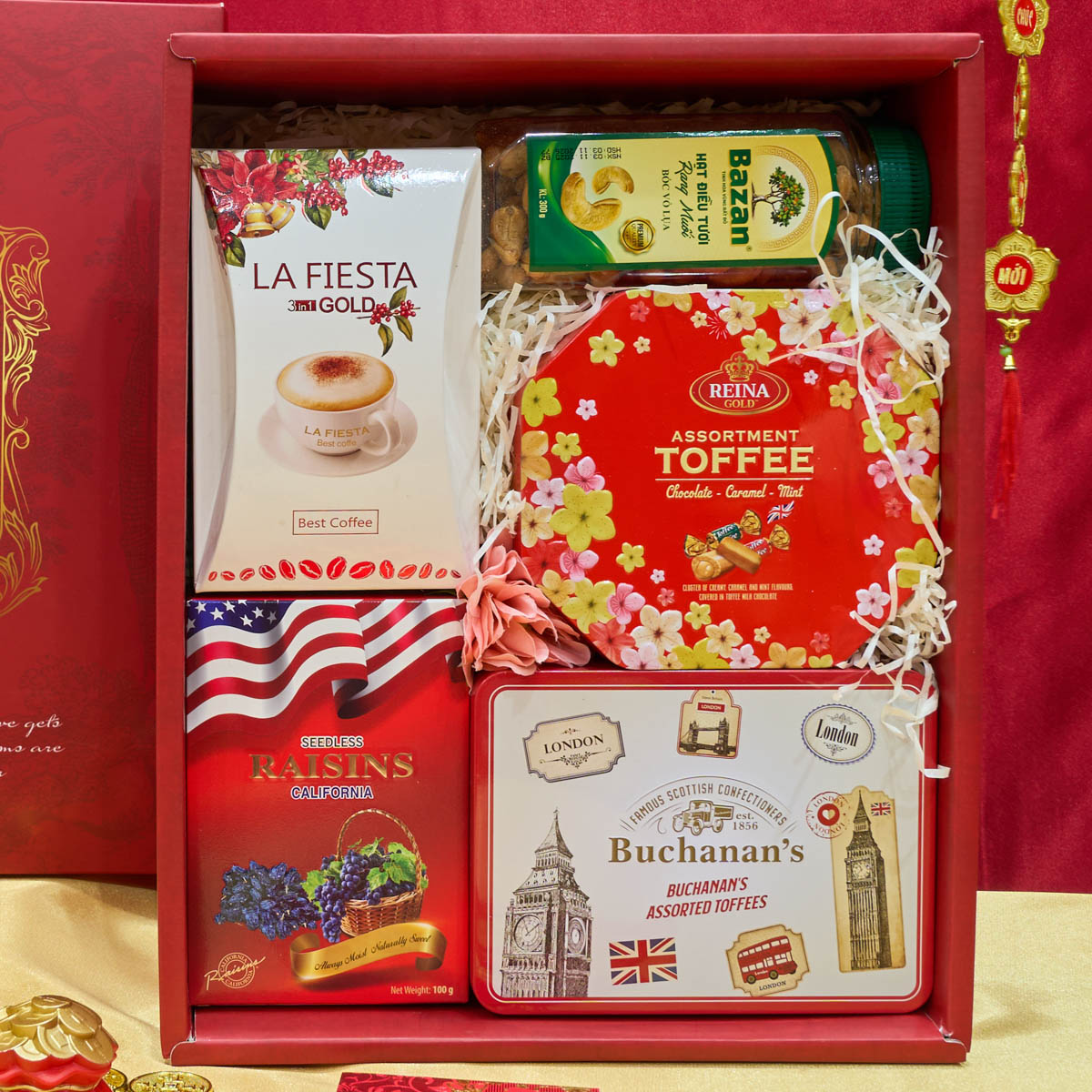 - Thành phần đa dạng từ bánh kẹo, hạt dinh dưỡng đến cà phê giúp set quà phù hợp cho nhiều thế hệ.