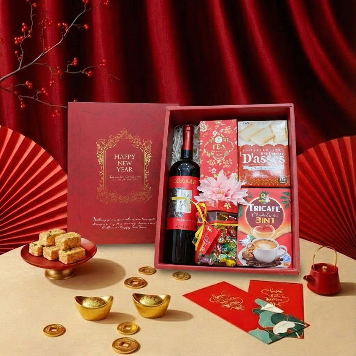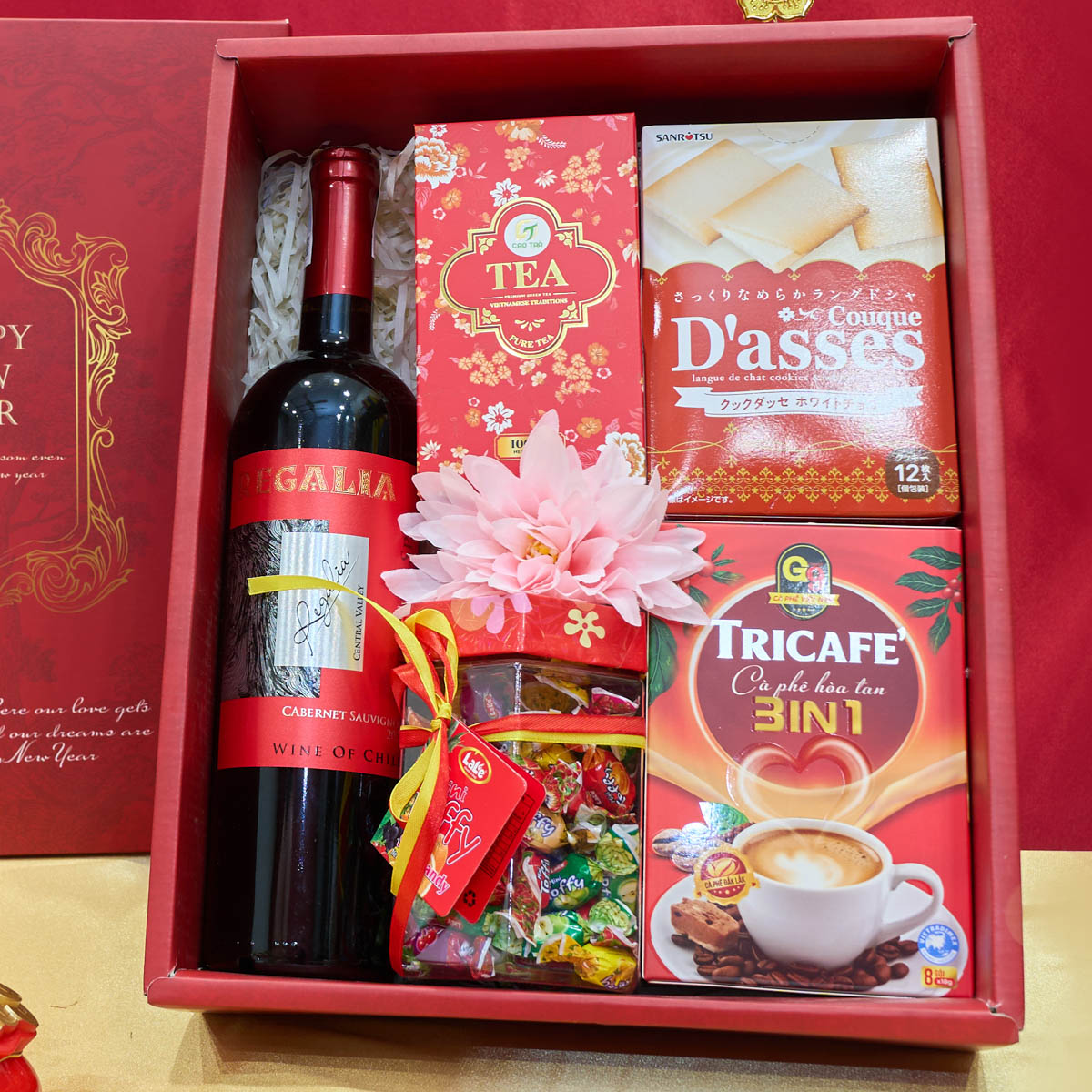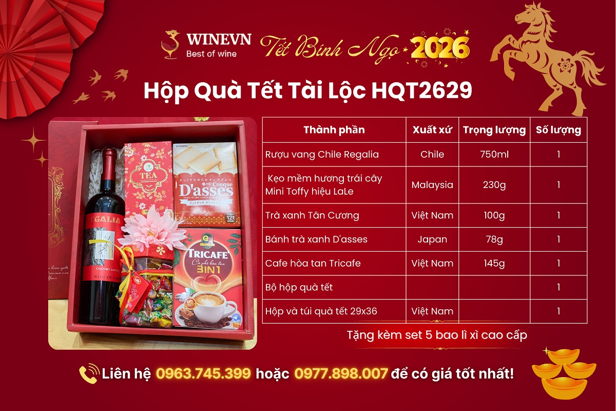 Hộp Quà Tết Tài Lộc HQT2629 là lựa chọn nổi bật trong bộ sưu tập hộp quà Tết 2026 với thiết kế sắc đỏ sang trọng, mang thông điệp chiêu tài đón lộc và khởi đầu hanh thông cho năm Bính Ngọ. Set quà được phối hợp hài hòa giữa rượu vang Chile, trà xanh, cà phê và bánh kẹo nhập khẩu, phù hợp biếu tặng đối tác, khách hàng và người thân trong dịp đầu xuân.