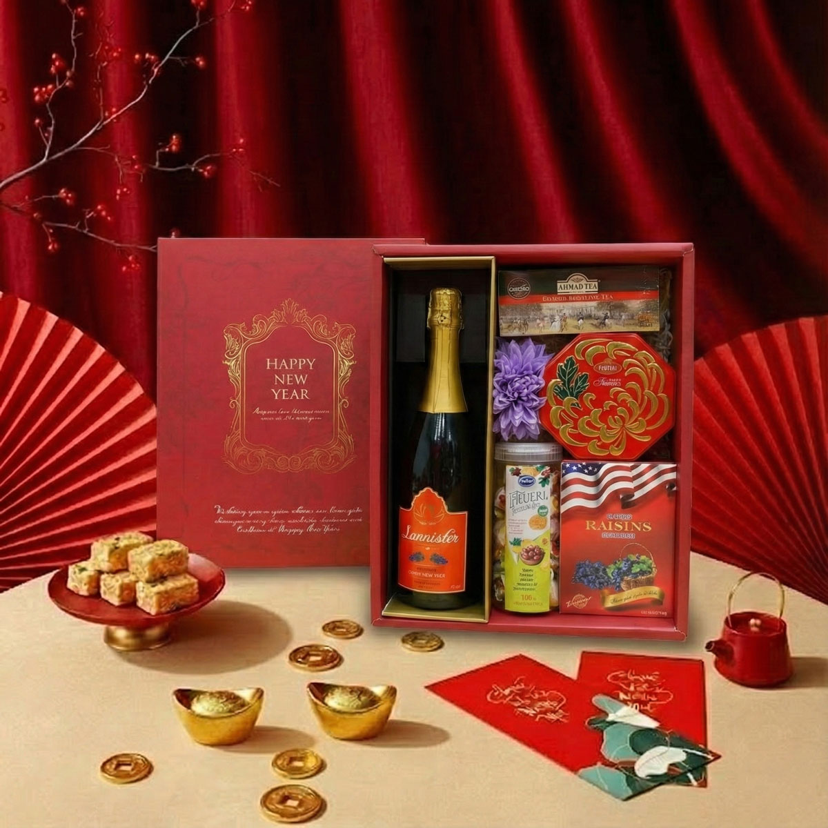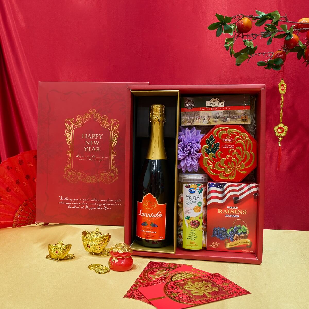 - Thành phần đa dạng từ nước nho, trà, bánh và trái cây khô phù hợp nhiều đối tượng