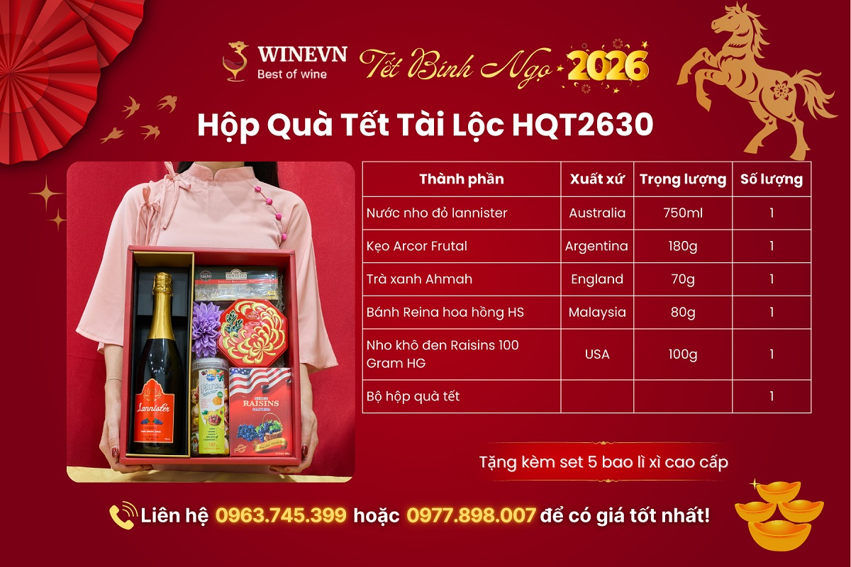Hộp Quà Tết Tài Lộc HQT2630 là lựa chọn nổi bật trong bộ sưu tập hộp quà Tết 2026 với thiết kế sắc đỏ trang trọng, gửi gắm thông điệp tài lộc sung túc và khởi đầu hanh thông cho năm Bính Ngọ. Set quà được kết hợp hài hòa giữa nước nho nhập khẩu, trà, bánh và các món Tết chọn lọc, phù hợp biếu tặng đối tác, khách hàng và người thân trong dịp đầu xuân.