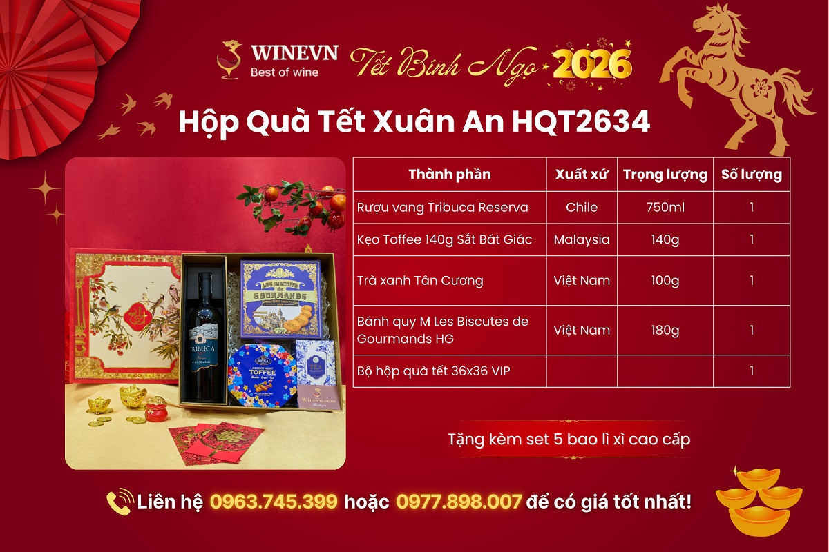 Hộp Quà Tết Xuân An HQT2634 là mẫu hộp quà Tết 2026, nổi bật với thiết kế màu xanh dương trang nhã, mang thông điệp an hòa và khởi đầu thuận lợi trong dịp Tết Bính Ngọ. Set quà được kết hợp hài hòa giữa rượu vang nhập khẩu, trà, bánh và các món Tết chọn lọc, phù hợp biếu tặng đối tác, khách hàng và người thân trong dịp đầu xuân.